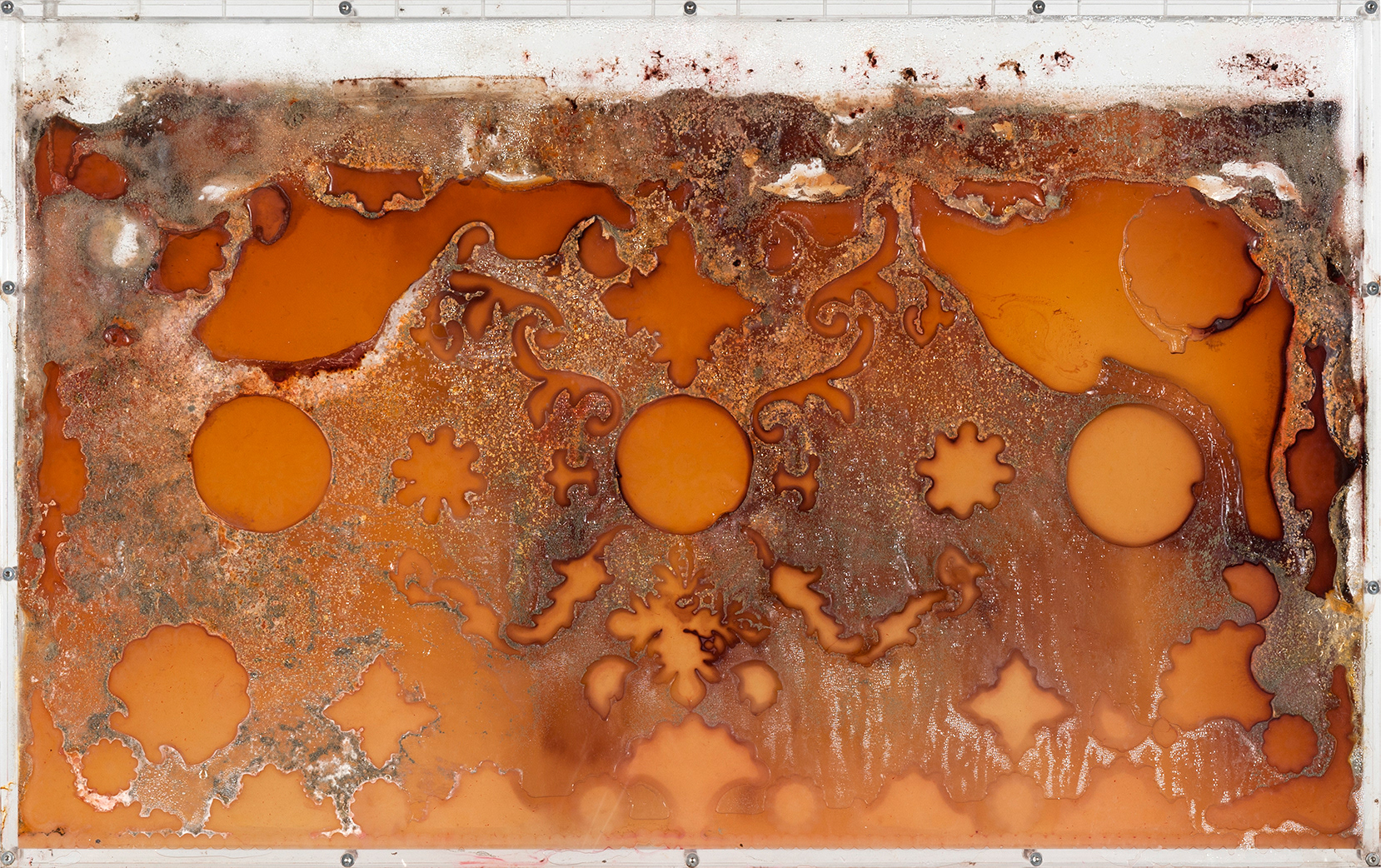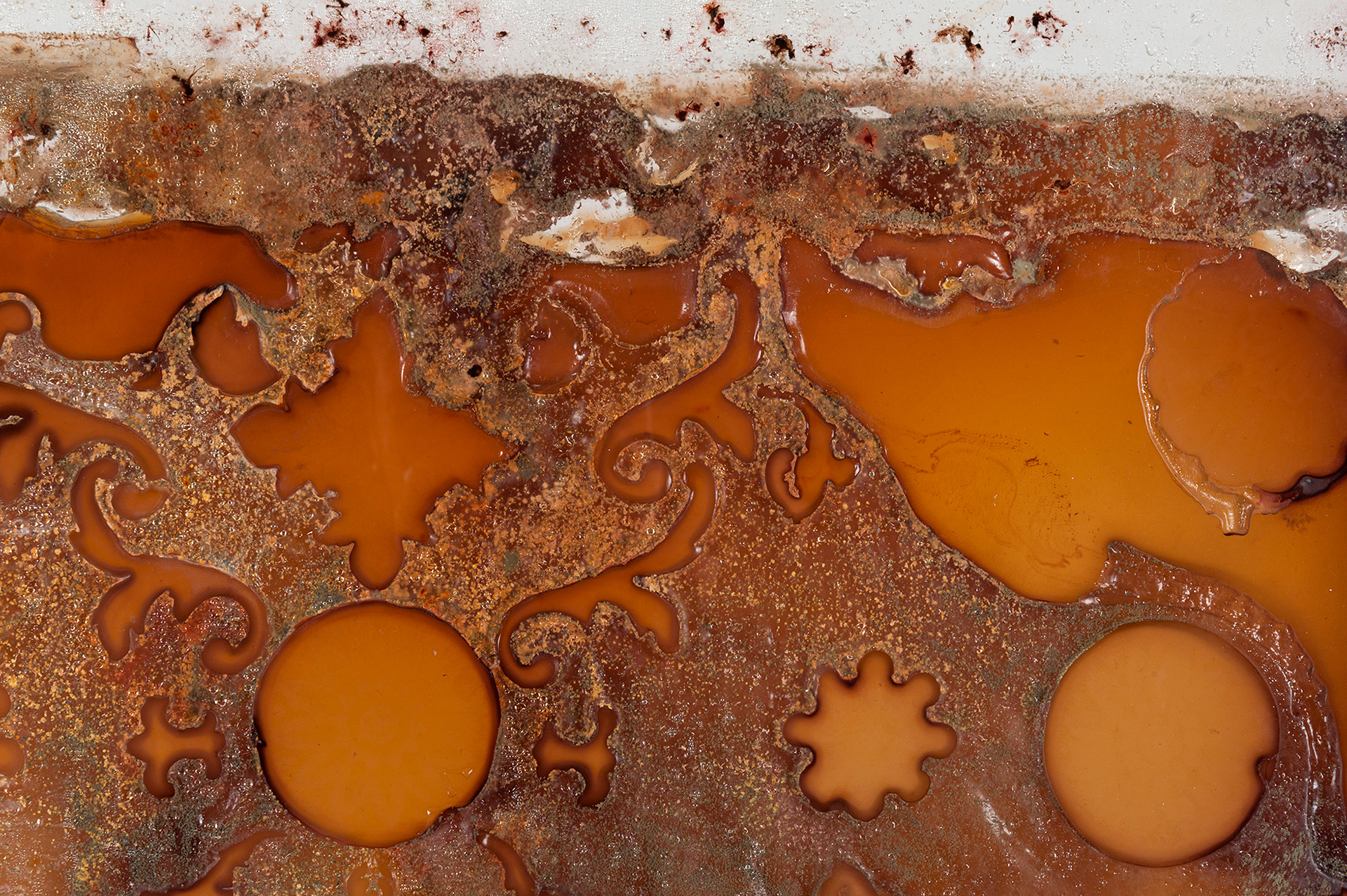 Presented as an expanded interpretation of print, Seethe challenges the idea of print as reproduction. Here, nothing repeats. The decorative stencils dissolve. Fungal life spreads. The surface darkens.