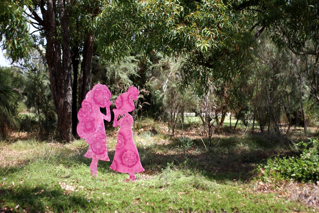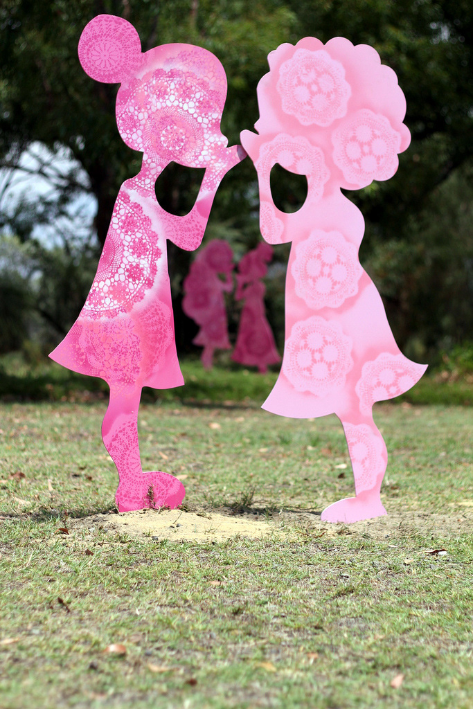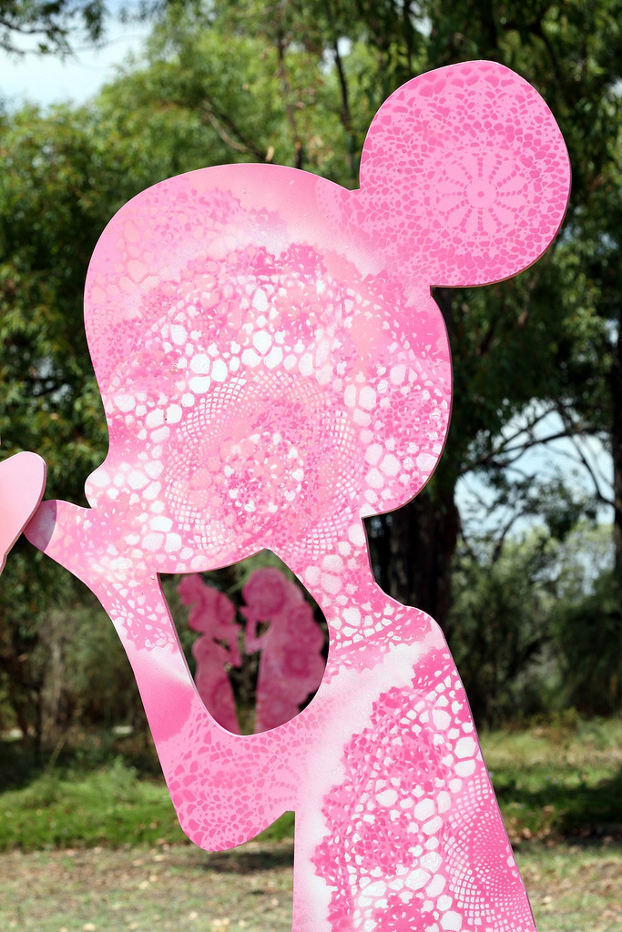 The installation comprises a group of pink metal silhouettes of little girls that evoke the aesthetic of 18th-century European fairytales. Their surfaces are embossed with wallpaper patterns drawn from aristocratic households of the same period, subtly linking colonial domestic ideals to the mechanisms of exclusion and containment. These girls are not simply decorative; they are choreographed into stillness. Held in place. Sweetly complicit.